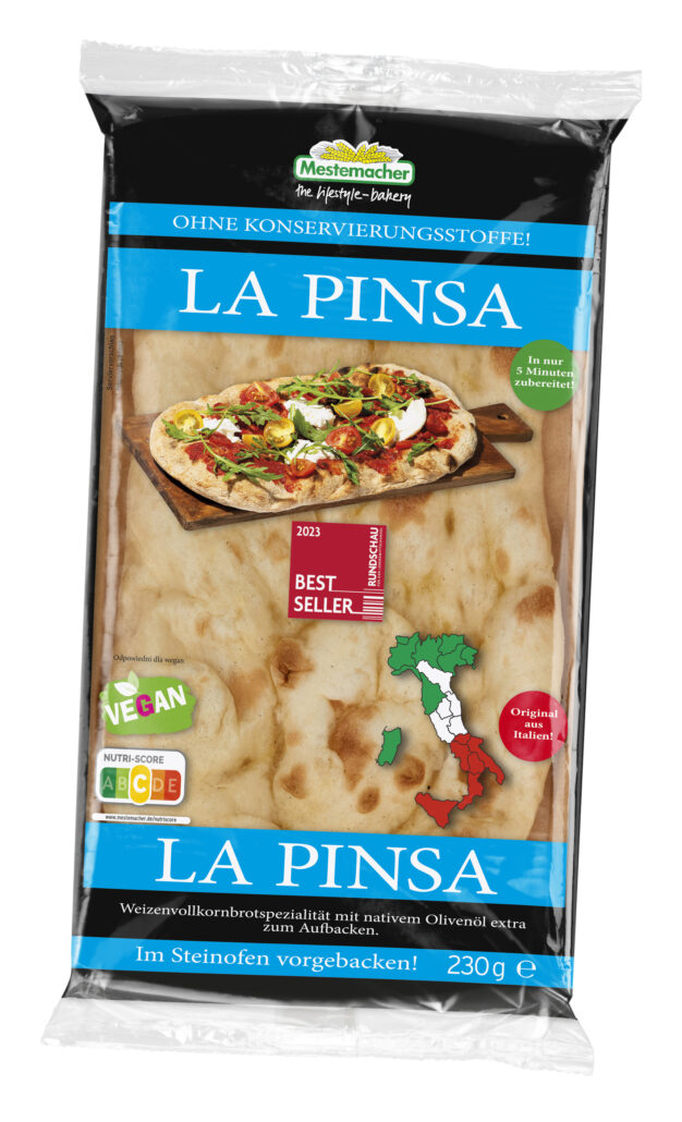 Pinsę wyjąć z opakowania. Pinsę razem z tacką do pieczenia włożyć do nagrzanego piekarnika. Piec w temperaturze 220°C (termoobieg) przez 5 minut. Po upieczeniu nałożyć ulubione dodatki i delektować się smakiem. Alternatywnie można nałożyć dodatki na pinsę przed pieczeniem i piec